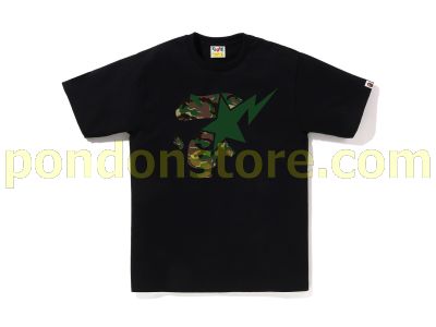 A BATHING APE : GLITCH WOODLAND CAMO APE FACE STA TEE black/green